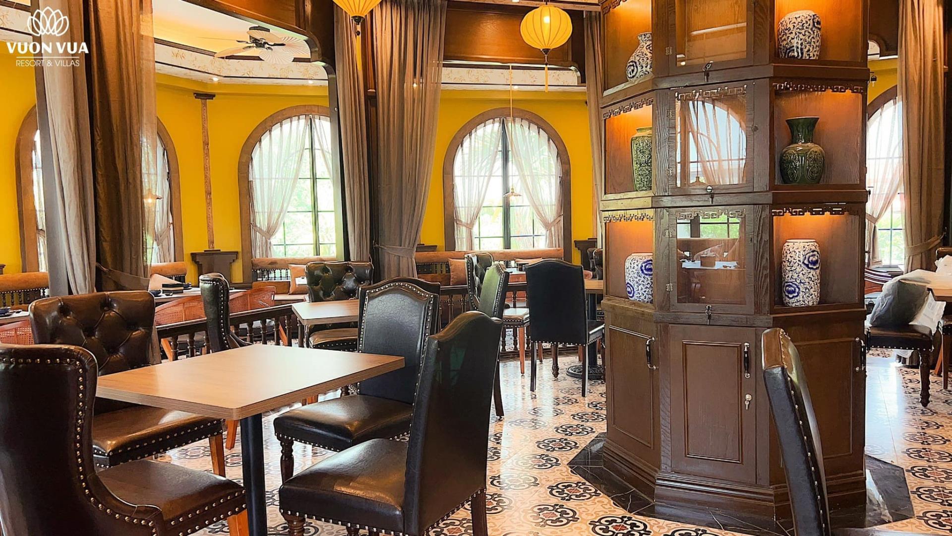 Nhà hàng nằm trọn không gian tầng 2 khu bể bơi bốn mùa trong nhà. Xung quanh được thiết kế các ô cửa kính vòm nhìn ra bên ngoài mang đến một không gian mở hài hòa với thiên nhiên.