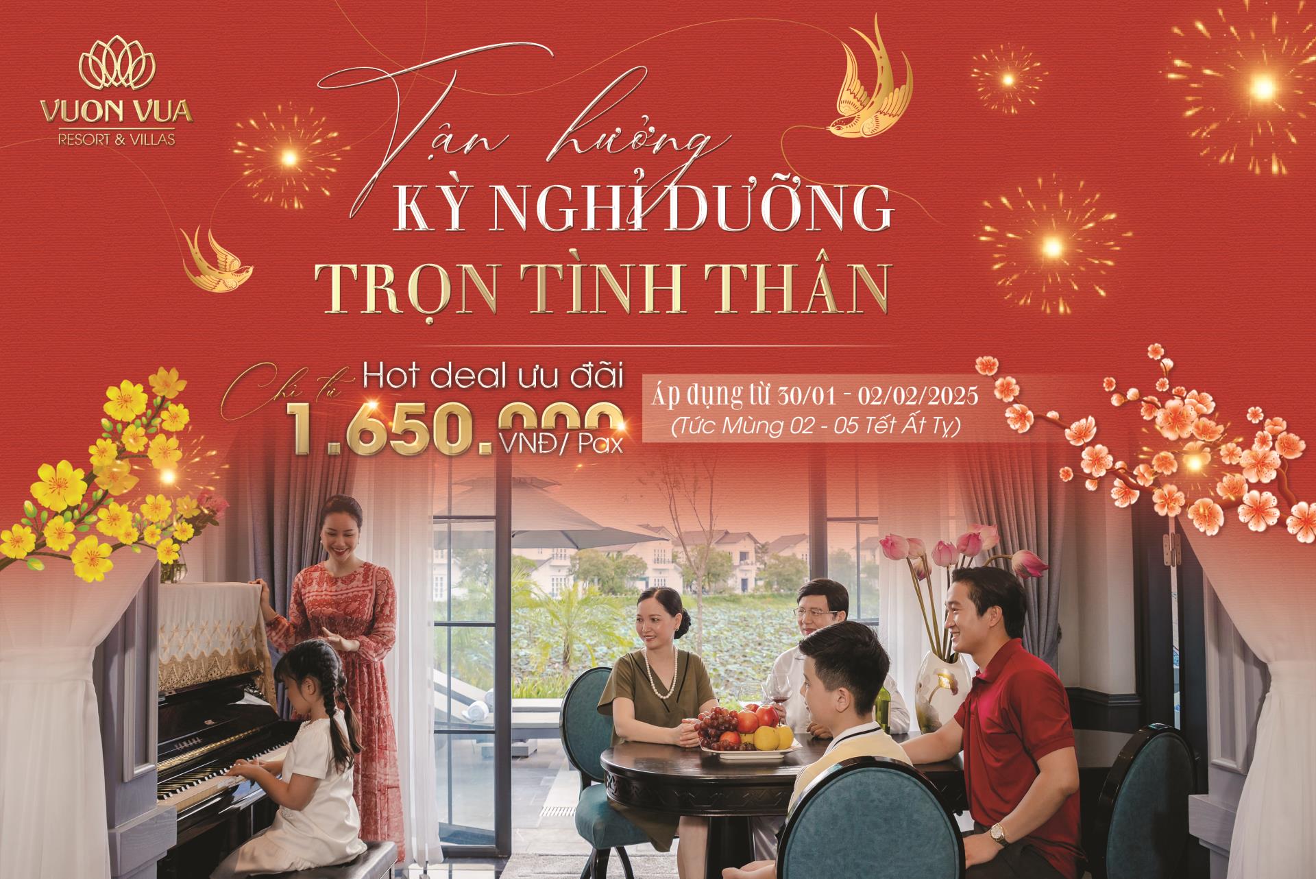 Vườn Vua Resort & Villas chào đón du khách dịp Tết Nguyên Đán 2025 với không gian thư giãn lý tưởng cùng các chương trình ưu đãi hấp dẫn và những sự kiện sôi động, hứa hẹn một kỳ nghỉ Tết đáng nhớ. Các gói khuyến mãi phòng nghỉ, cùng nhiều hoạt động giải trí độc đáo, đang chờ đón mọi du khách về Vườn Vua trải nghiệm.