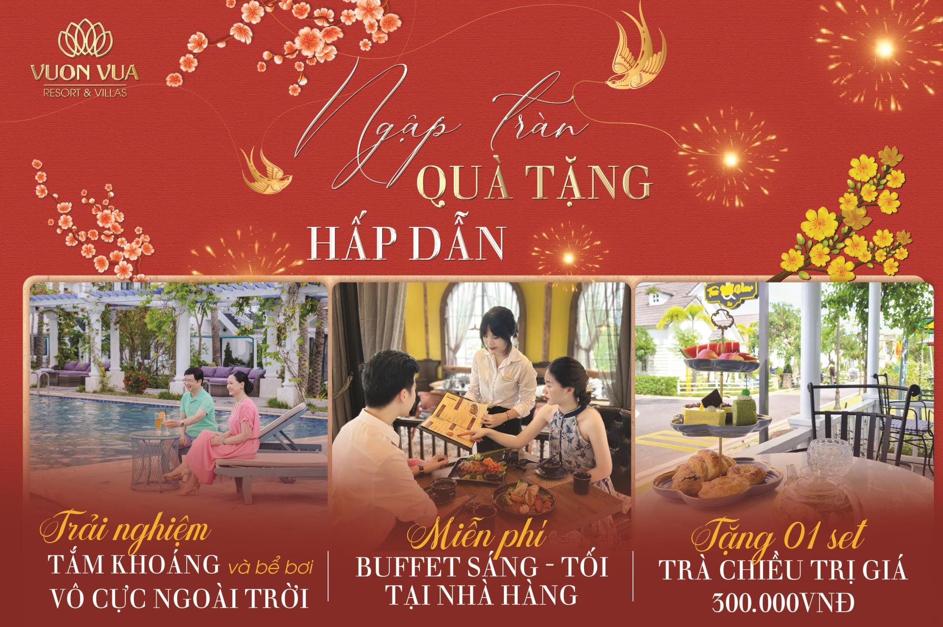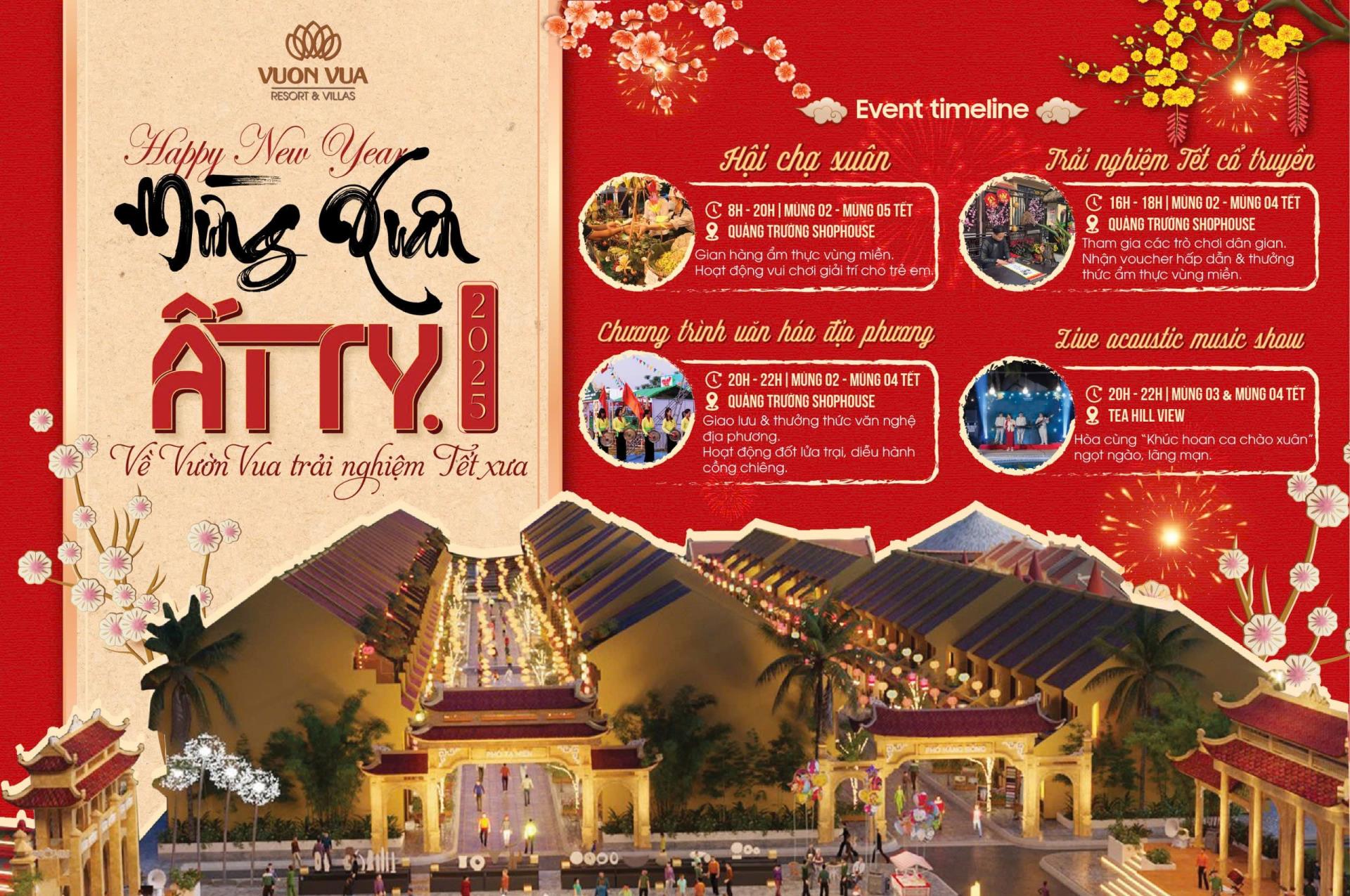 Trong dịp Tết Nguyên Đán, Vườn Vua Resort & Villas tổ chức loạt chương trình sẽ diễn ra từ ngày mùng 2/1- 4/1/2025 Tết Âm Lịch hứa hẹn với nhiều hoạt động hấp dẫn và đặc sắc, mang đậm bản sắc văn hóa dân tộc.
