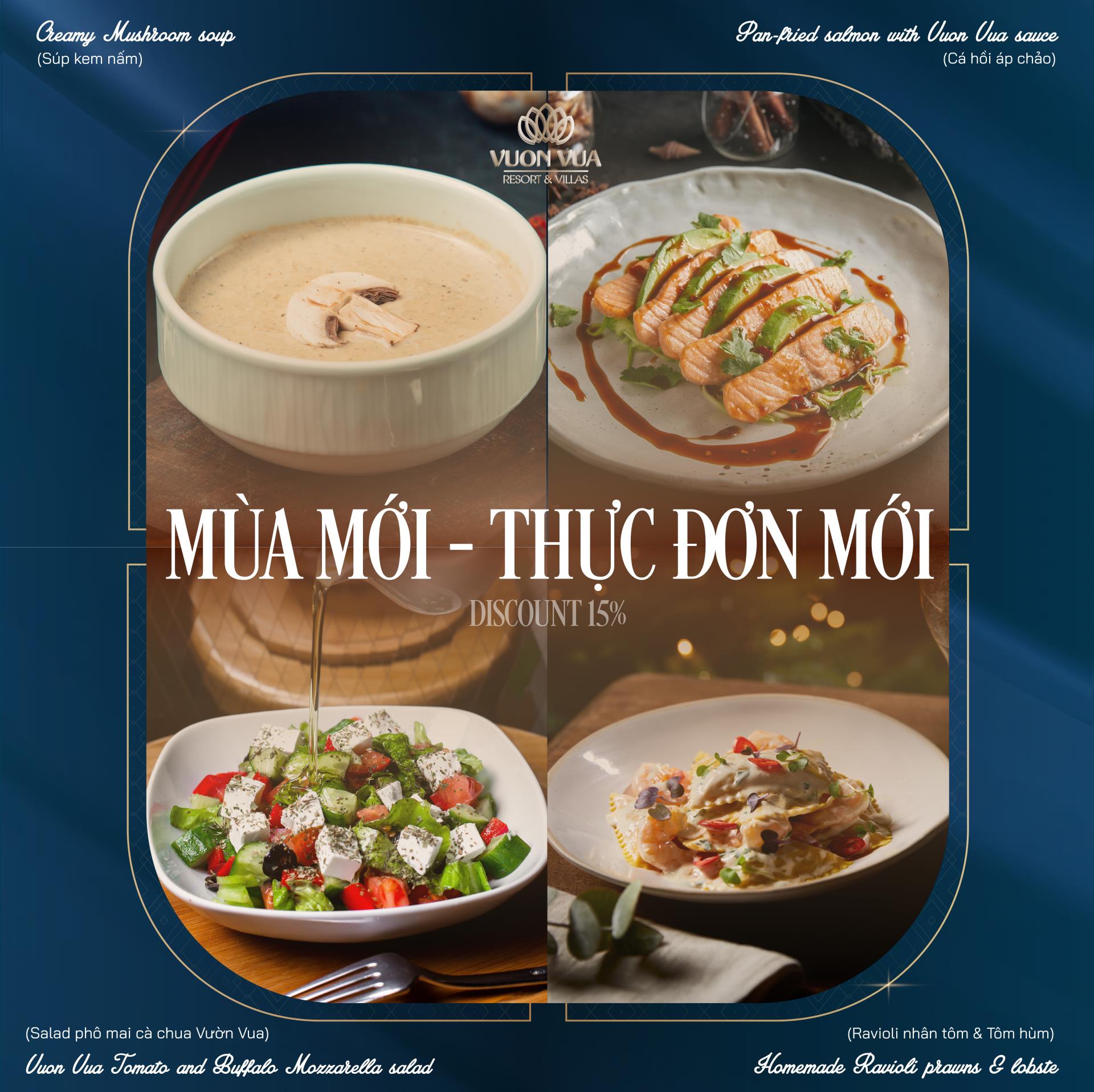 * Vuon Vua Tomato and Buffalo Mozzarella salad / Salad phô mai cà chua Vườn Vua: Với thành phần chính là Phô mai sữa trâu trộn cùng cà chua sạch trồng tại Vườn Vua kết hợp thêm các loại gia vị như: Sốt lá quế, lá quế tây, giấm đen, hạt thông sẽ mang lên bàn tiệc một món ăn tươi mát, kết hợp cùng món chính trong những ngày thời tiết nóng.