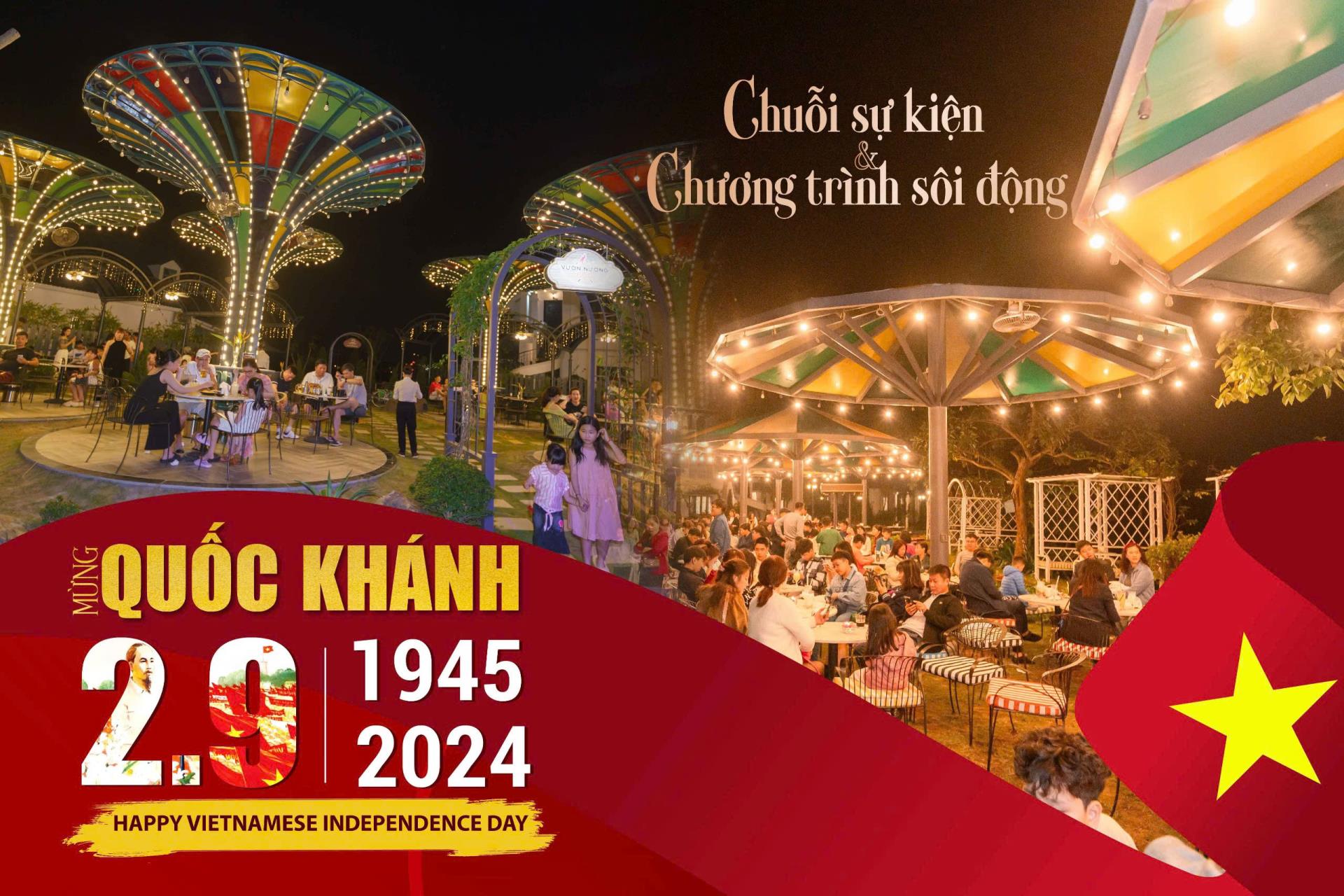 Hòa chung không khí sôi động của kỳ nghỉ Quốc Khánh đang đến, Vườn Vua Resort & Villas sẽ tổ chức chuỗi sự kiện thú vị như: Đêm tiệc Buffet & Chương trình ca nhạc; Chương trình “Live Acoustic Music”; Chương trình “EDM Night Music”; Lễ hội “Kolor Fest”... Theo lịch trình dự kiến, các hoạt động chủ yếu được tổ chức và diễn ra tại các điểm sân khấu ngoài trời giữa thiên nhiên, mang đến cho du khách nhiều trải nghiệm bùng nổ cảm xúc.