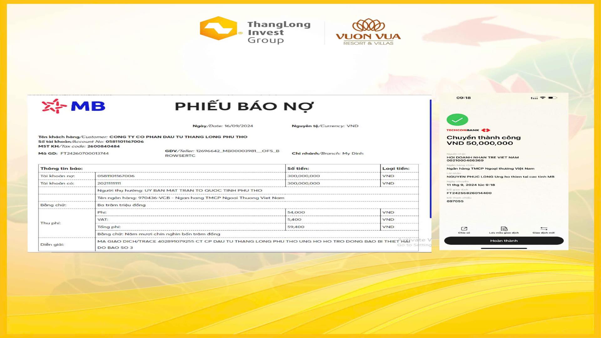 Cụ thể, Tập đoàn Đầu tư Thăng Long đã trao tặng 300 triệu đồng cho Ủy ban Mặt trận Tổ quốc tỉnh Phú Thọ và 50 triệu đồng cho Hội Doanh nghiệp trẻ Việt Nam. Số tiền này sẽ được sử dụng để khắc phục thiệt hại do bão lũ gây ra, bao gồm việc sửa chữa nhà cửa, trường học, cơ sở y tế và các công trình giao thông tại Phú Thọ và các tỉnh phía Bắc. Mục tiêu của sự hỗ trợ là giúp các gia đình bị ảnh hưởng nhanh chóng ổn định cuộc sống và tái thiết lại cơ sở hạ tầng bị hư hại.