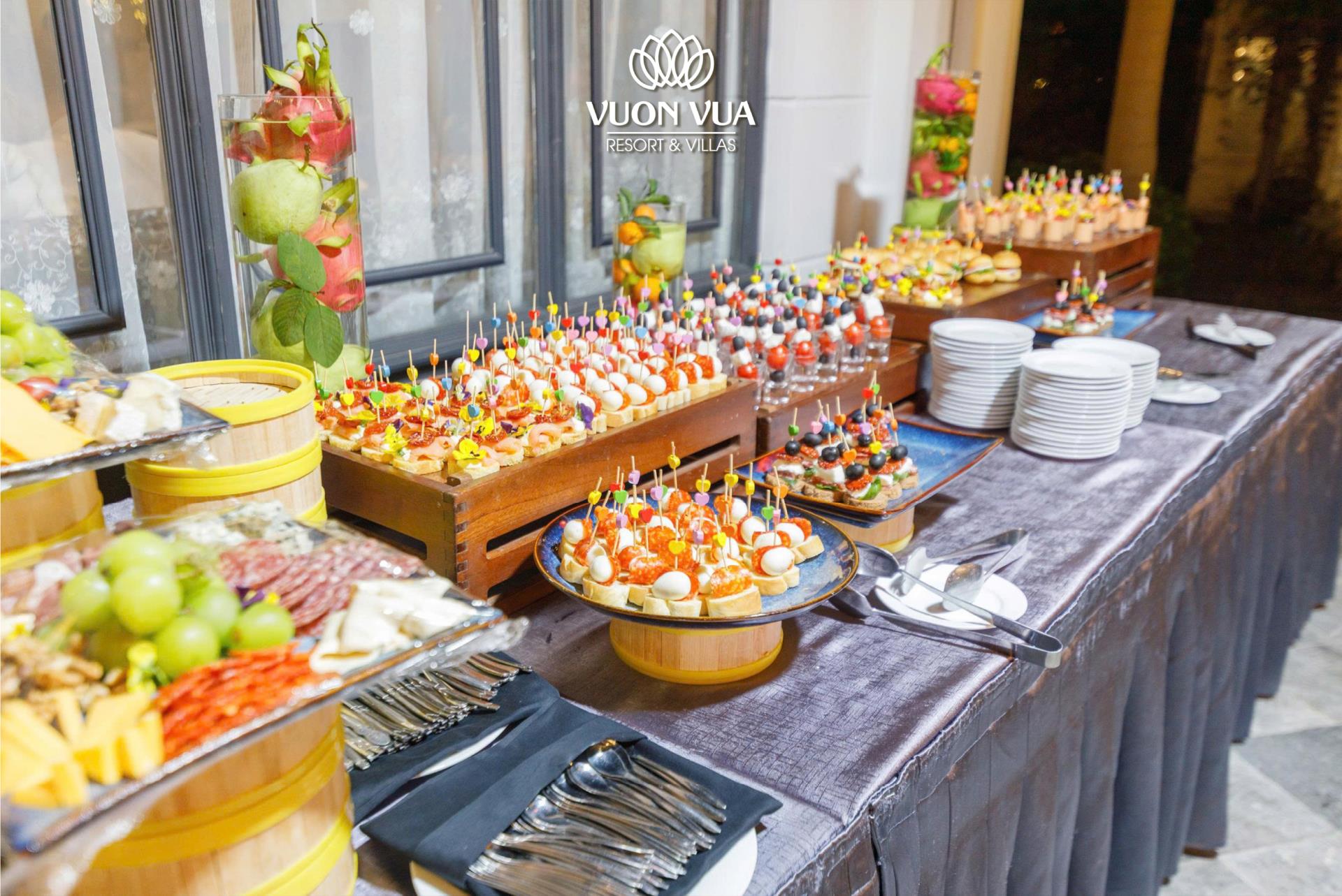 Ngay từ 19h00, không khí lễ hội đã lan tỏa khắp khuôn viên Vườn Vua Resort & Villas. Khách tham dự háo hức check-in, thưởng thức welcome drink và tiệc finger food trong không gian được bài trí tinh tế, điểm xuyết sắc xuân dịu dàng.