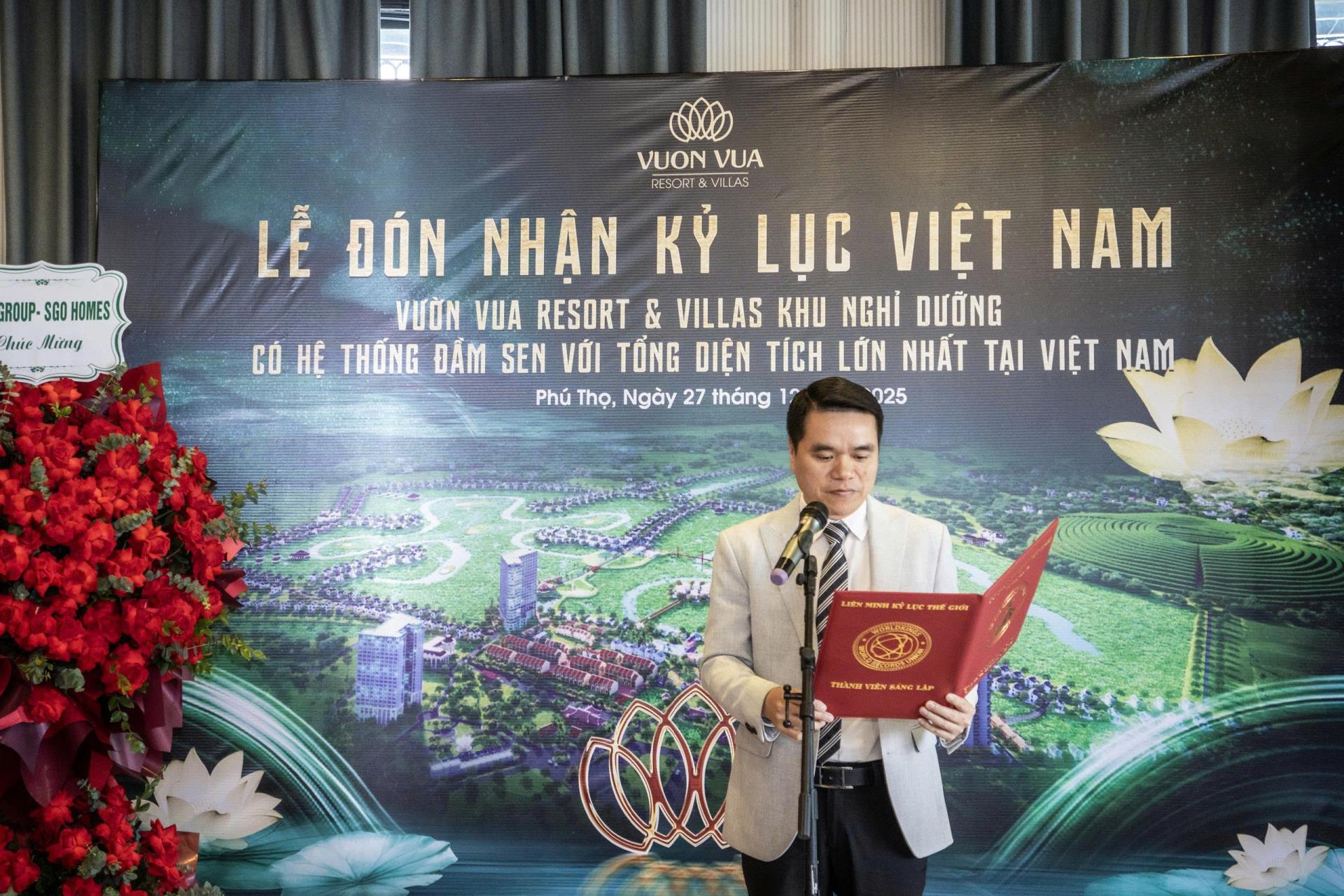 Tại sự kiện, ông Cao Thế Anh – đại diện Tổ chức Kỷ lục Việt Nam đã công bố và đọc Quyết định xác lập Kỷ lục Việt Nam dành cho Vườn Vua Resort & Villas, chính thức ghi nhận khu nghỉ dưỡng là đơn vị sở hữu hệ thống đầm sen có tổng diện tích lớn nhất tại Việt Nam.