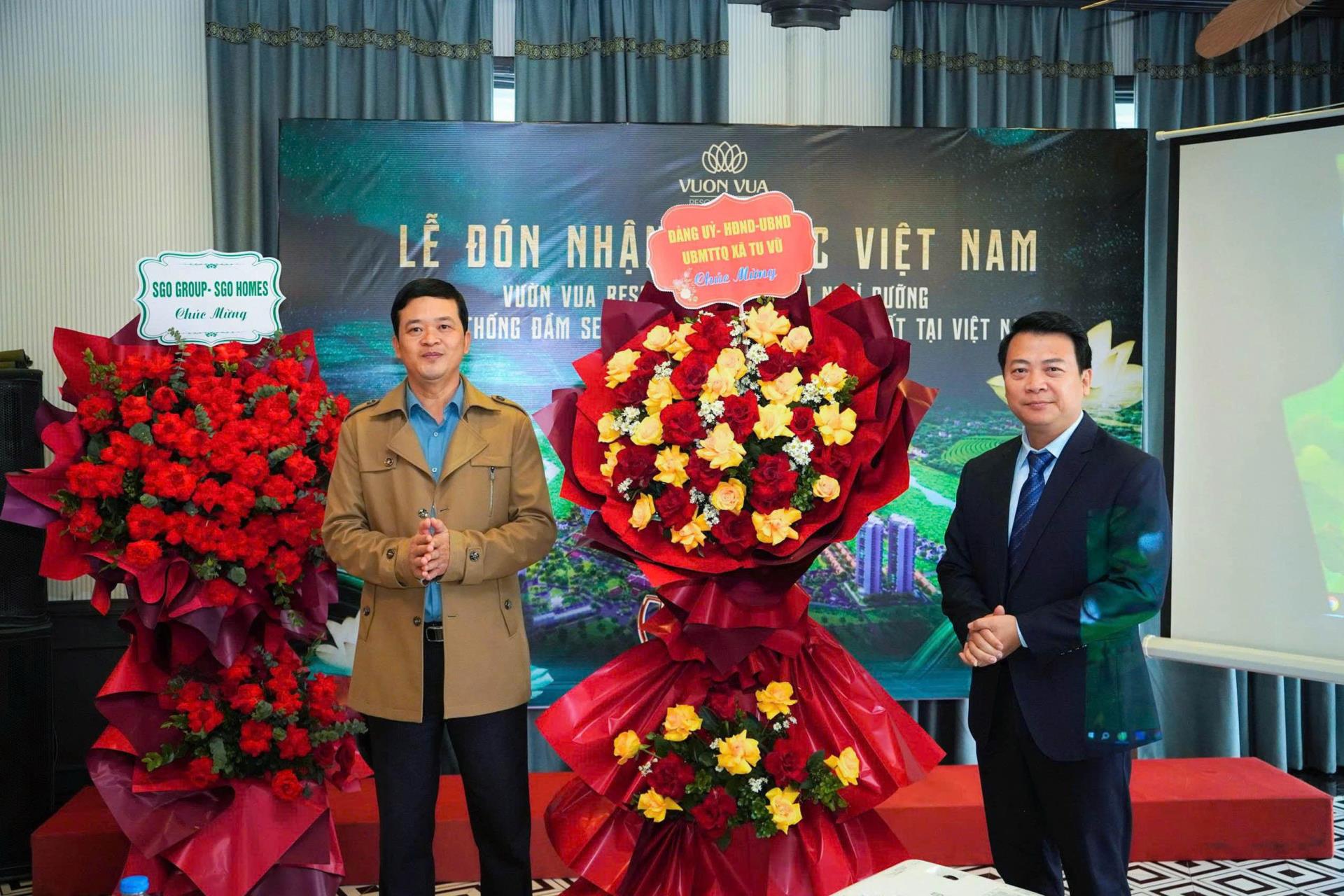 Phía Lãnh đạo UBND xã Tu Vũ cùng các đối tác cũng gửi lẵng hoa chúc mừng, thể hiện sự ghi nhận và đánh giá cao những giá trị thiên nhiên mà Vườn Vua Resort & Villas đang gìn giữ.